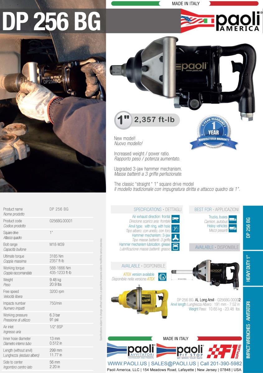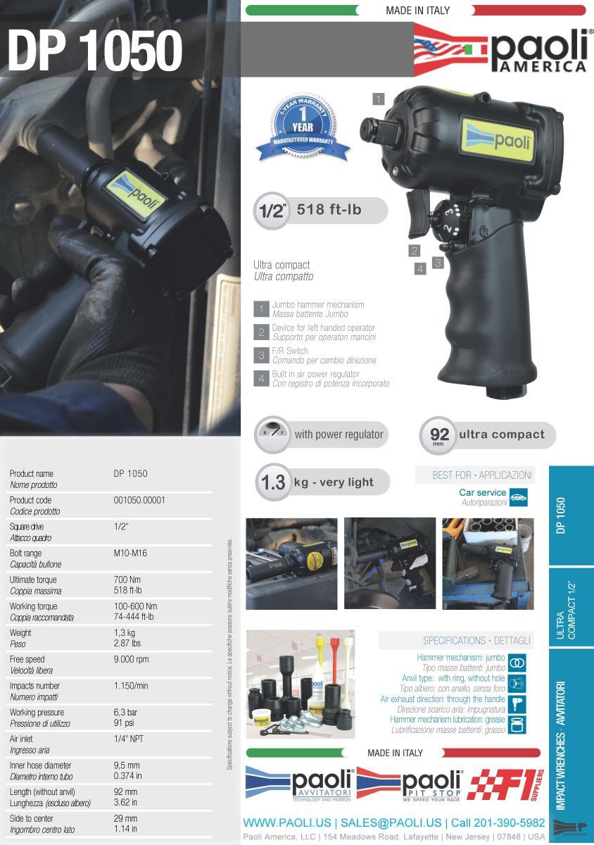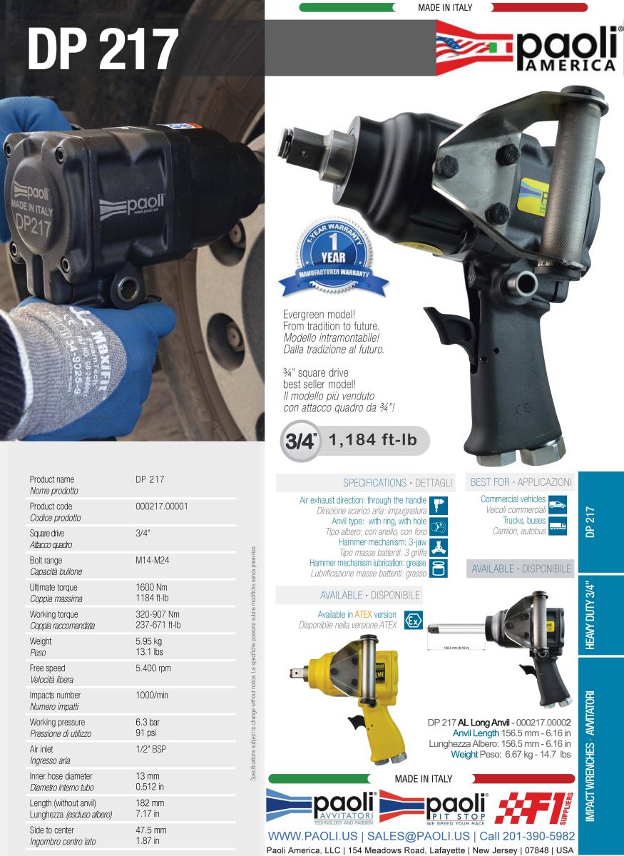 Dino Paoli offers 13 different models of racing wheel guns and 32 automotive and industrial models of impact wrenches. Many models are available with medium and long anvil sub-