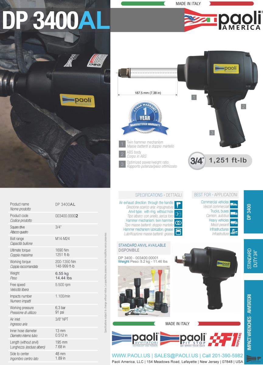 Dino Paoli offers 13 different models of racing wheel guns and 32 automotive and industrial models of impact wrenches. Many models are available with medium and long anvil sub-